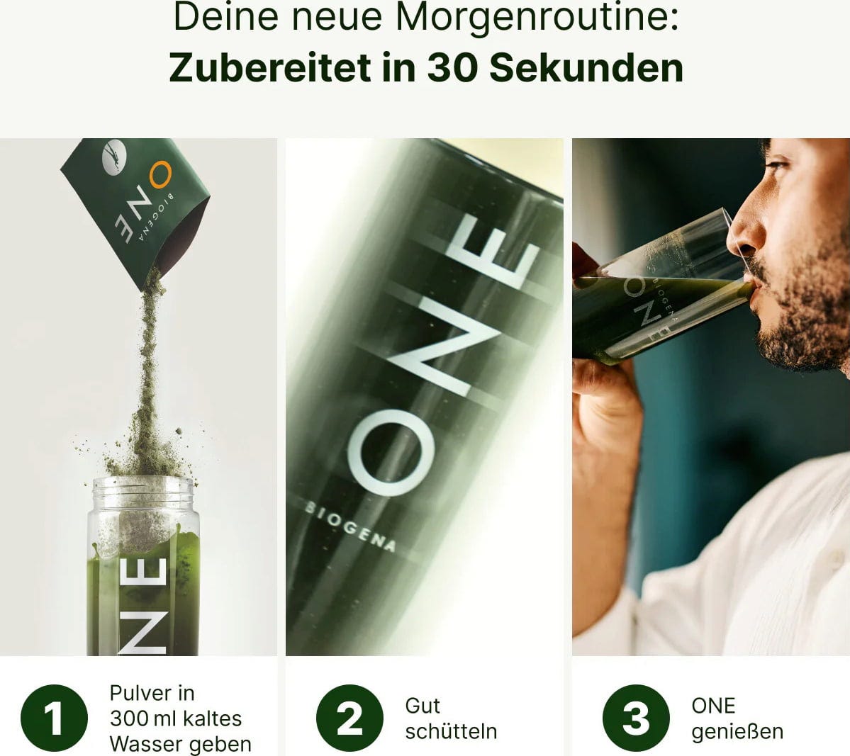 A BIOGENA ONE a következő generációs zöld ital, amely 99 értékes összetevőből álló táplálkozási összetételével nyűgöz le. Az egyedülálló keverék 13 vitamint, 11 ásványi anyagot és nyomelemet, 10 lakto- és bifidobaktérium kultúrát és 49 válogatott növényi anyagot tartalmaz. Ide tartozik a szőlő, a szőlőmag, a gránátalma, az olívalevél, az áfonya, a fekete ribizli és a citrusfélék, amelyek értékes antioxidánsok forrásai. A BIOGENA ONE ízvilágban is igazi szenzáció. Alma, kivi, uborka és egy csipet wasabi levélpor az élvezet különleges pillanatává varázsolja a napi tápanyagbevitelt. A napi étrend támogatására fejlesztették ki.