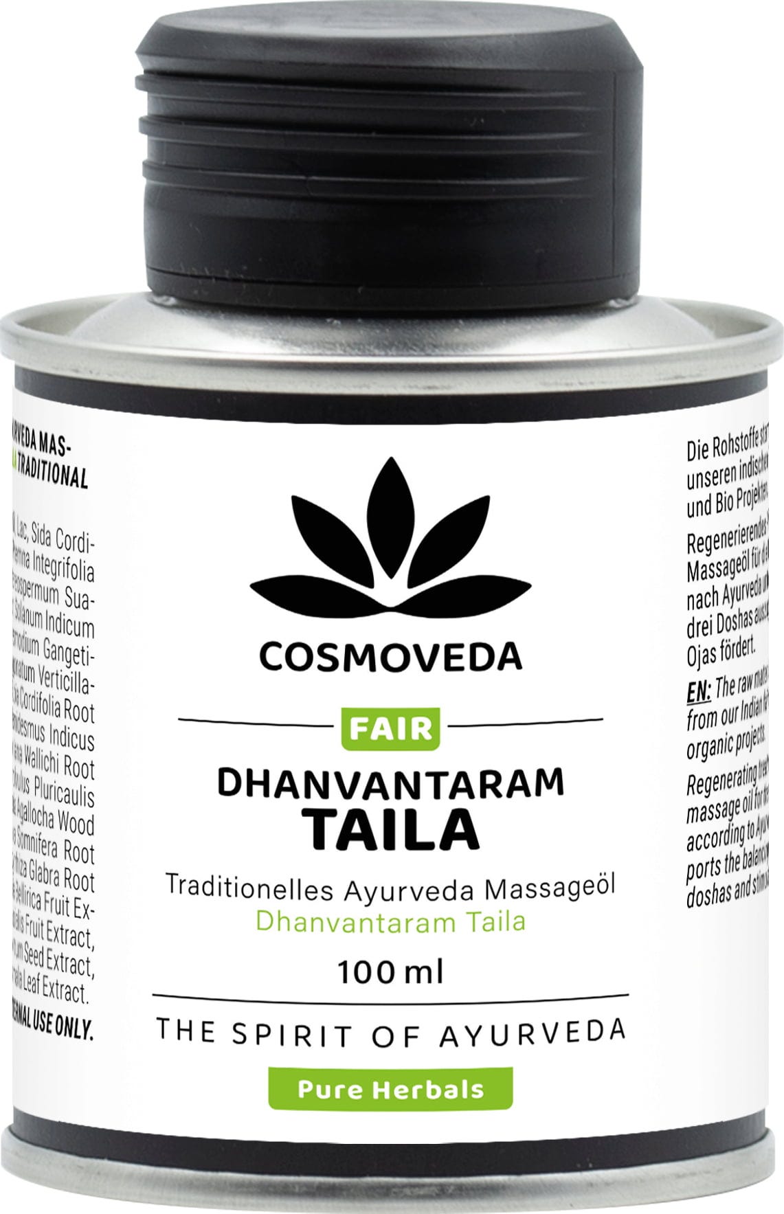 Az Ayus Taila Dhanwantharam egy különösen gazdag olaj, valamint az illata rendkívül fűszeres. Ez tipikusan az olajra jellemző, valamint rendkívül magas minőséget támaszt alá. Az előállítás során kifogástalan szezámolajat alkalmaznak. Ezt a gyógynövényfőzettel együtt addig hevítik, amíg a főzetben lévő víz teljesen el nem párolog, és a növényi összetevőket fel nem szívja az olaj. Az egész folyamat tradícionális, átadott receptúra alapján történik.