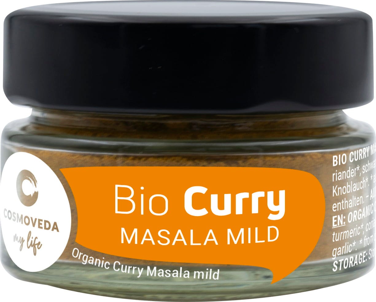 A Cosmoveda Curry Masala enyhe Bio terméke 9 értékes fűszer keveréke, amelyet az indiai és ájurvédikus konyhában sokféleképpen felhasználnak.