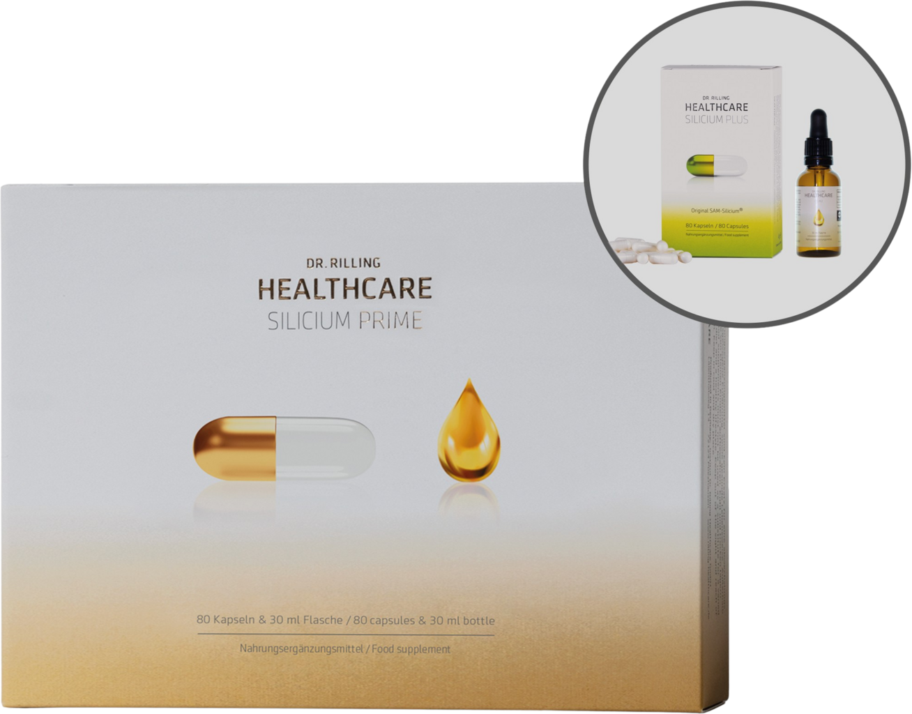 A Dr. Rilling Healthcare Silicon Prime egy gondosan összeállított étrendkiegészítő csomag, amely két termékből áll: Silicium Plus kapszulából és D3/K2 cseppekből. Ez a kombináció gondosan válogatott kiegészítést biztosít az egész család napi szükségleteihez.