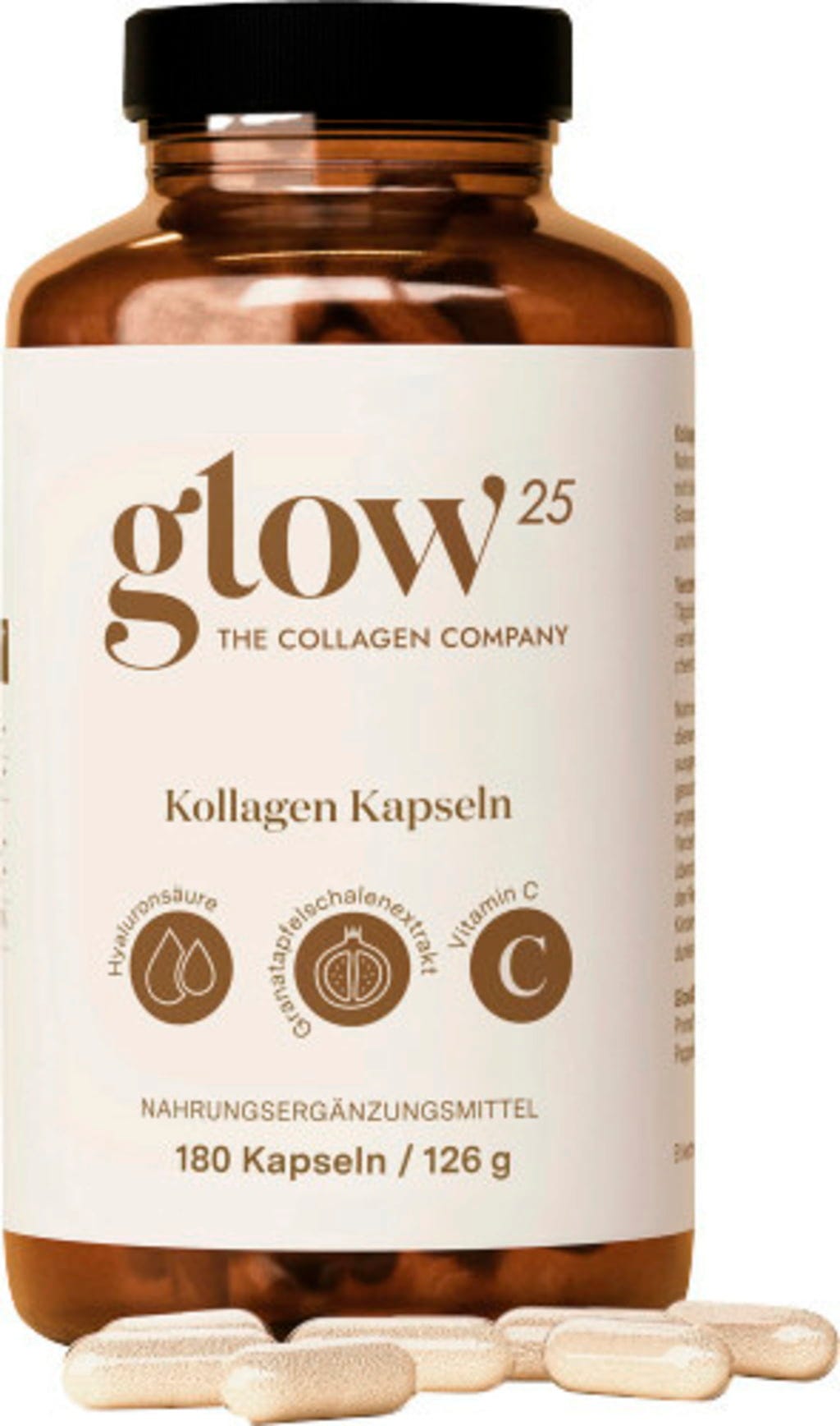 A Glow25 kollagén kapszulák kiváló minőségű kollagénpeptideket kombinálnak hialuronsavval, gránátalmahéj-kivonattal és természetes C-vitaminnal. A C-vitamin hozzájárul a normál kollagénképződéshez, amely a bőr normál működéséhez szükséges. A kapszulák ideálisak kiegészítőként vagy praktikus alternatívaként a Glow25 kollagén porhoz – tökéletesek mindennapi használatra vagy útközben.