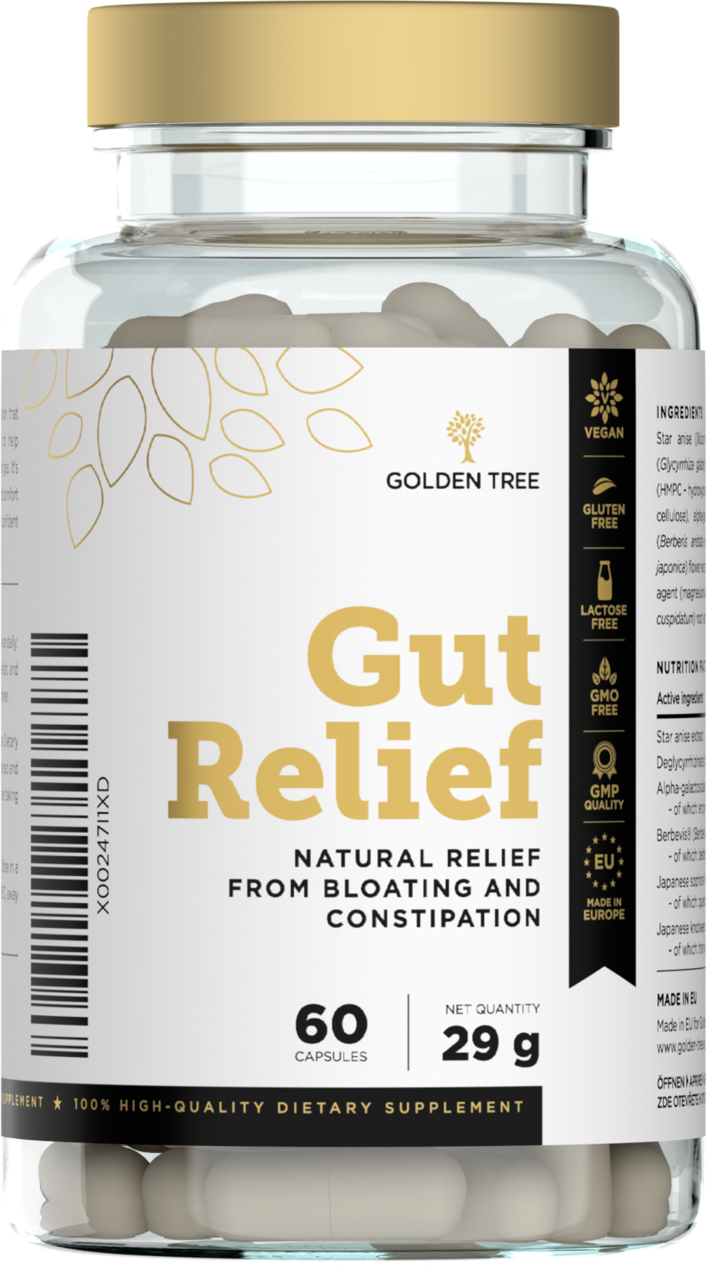 A Golden Tree Gut Relief 5 kiváló minőségű növényi kivonatot ötvöz az alfa-galaktozidáz enzimmel. A vegán kapszulák koffein- és egyéb stimulánsoktól mentesek.