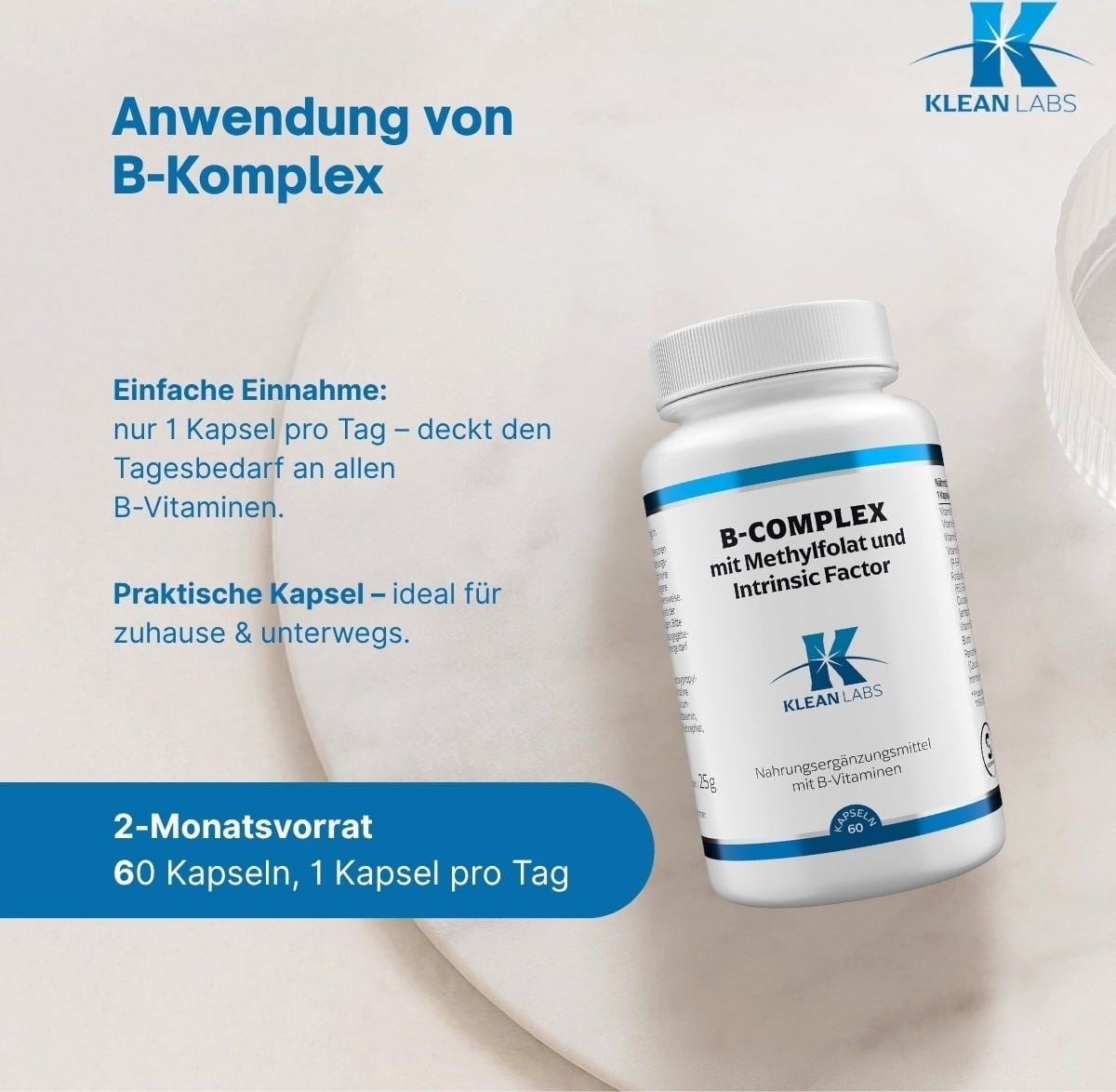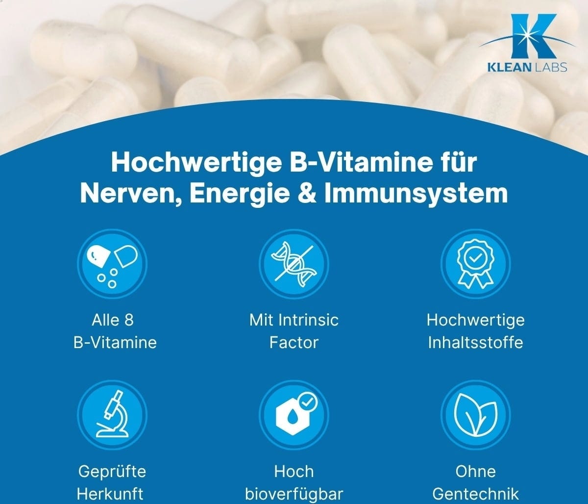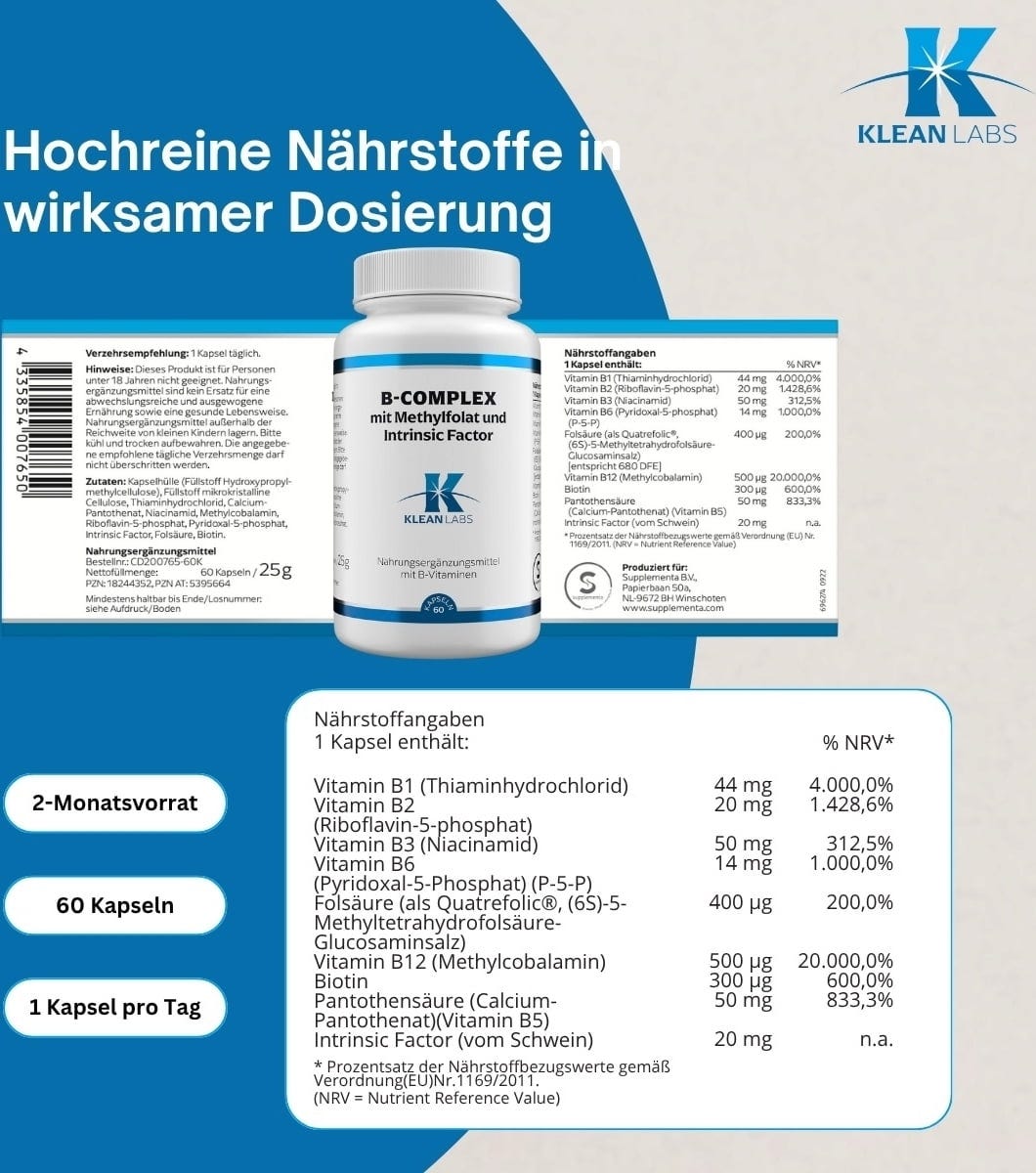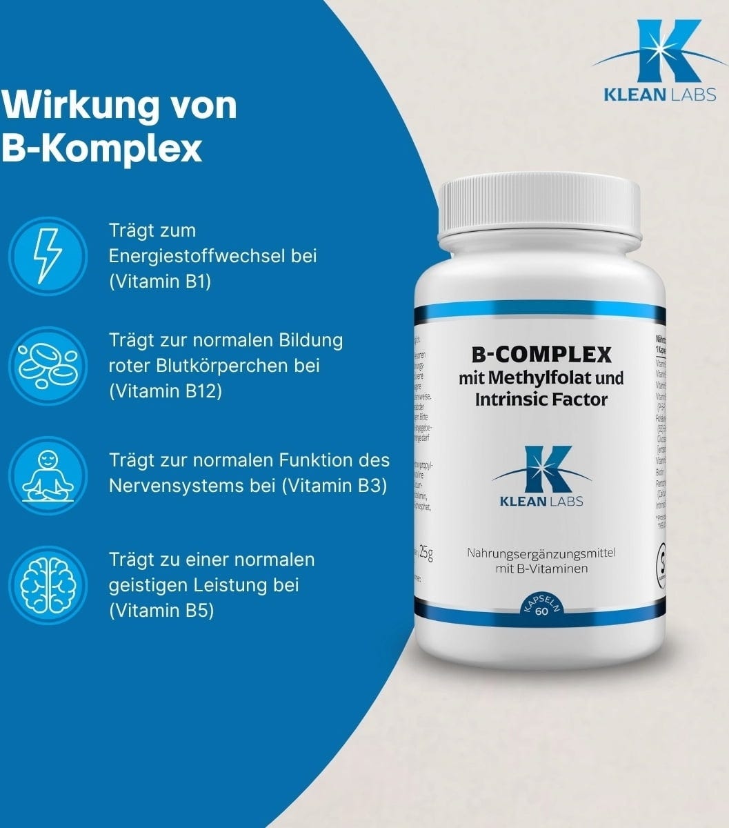 A KLEAN LABS B-Complex B-vitamin komplexet tartalmaz metil-folsavval és Intrinsic Factor-ral. A B-vitaminok közé tartozik a tiamin, a riboflavin, a niacin, a B6-vitamin, a folsav, a B12-vitamin, a biotin és a pantoténsav. A kapszulák géntechnológia mentesek.