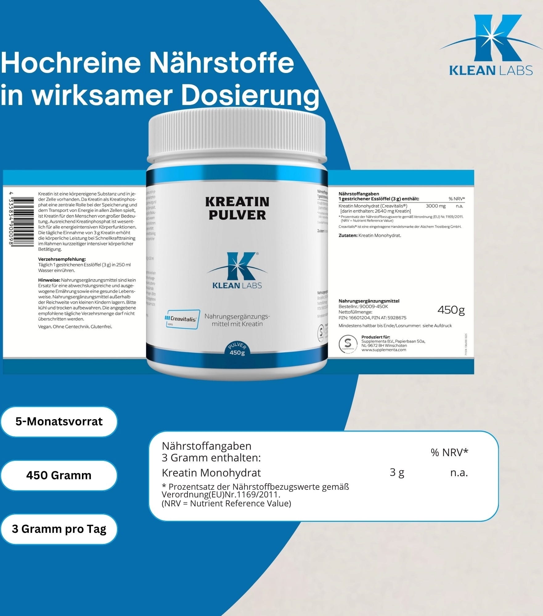 KLEAN LABS Creavitalis® kreatin por, 450 g