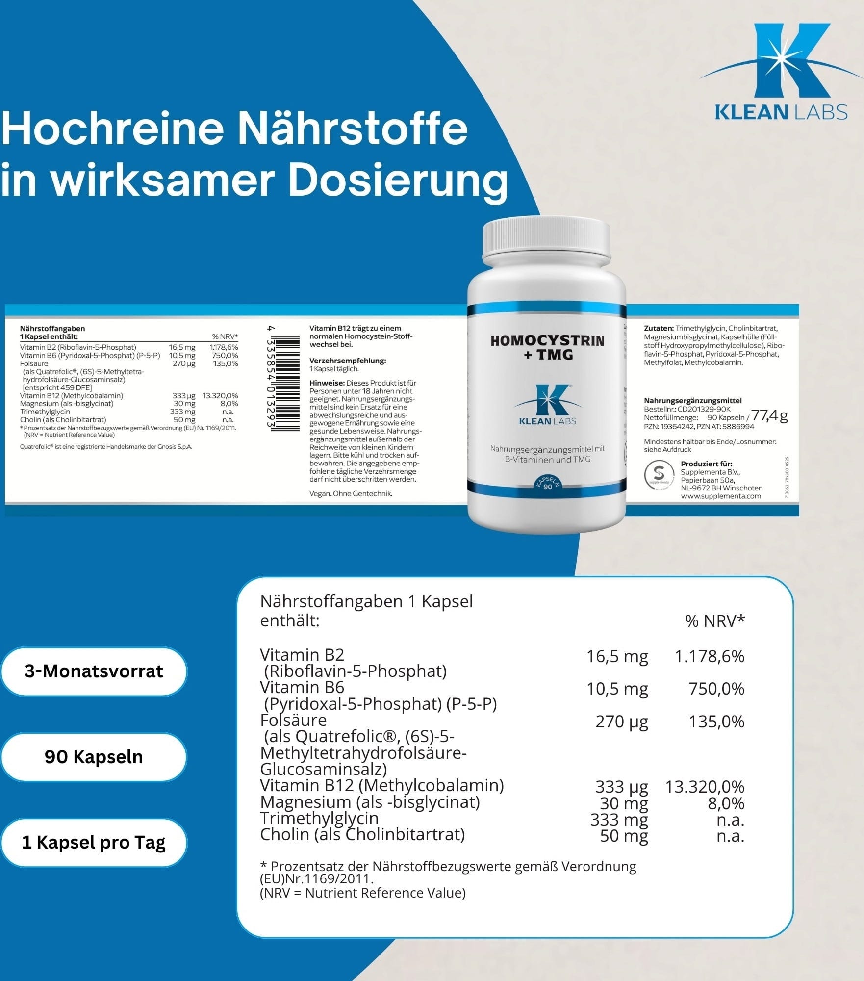 KLEAN LABS Homocystrin + TMG, 90 kapszula