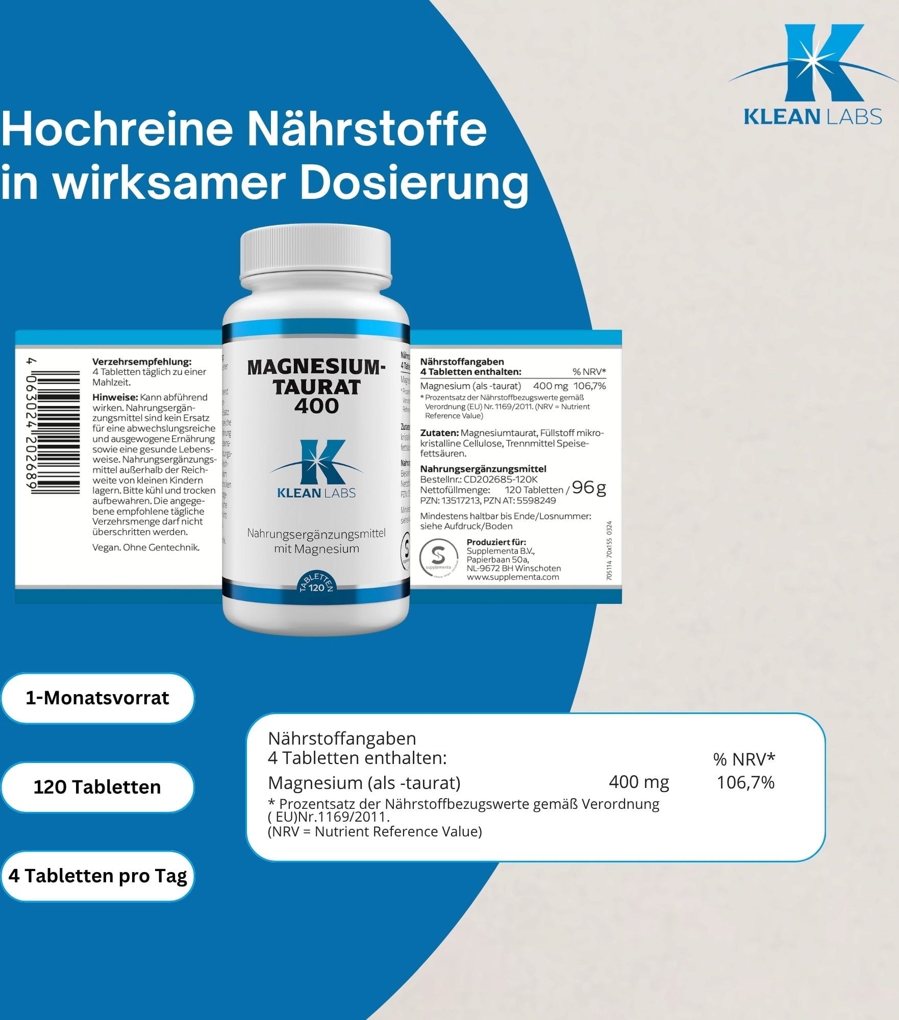 KLEAN LABS Magnesium-Taurat 400, 120 tabletta