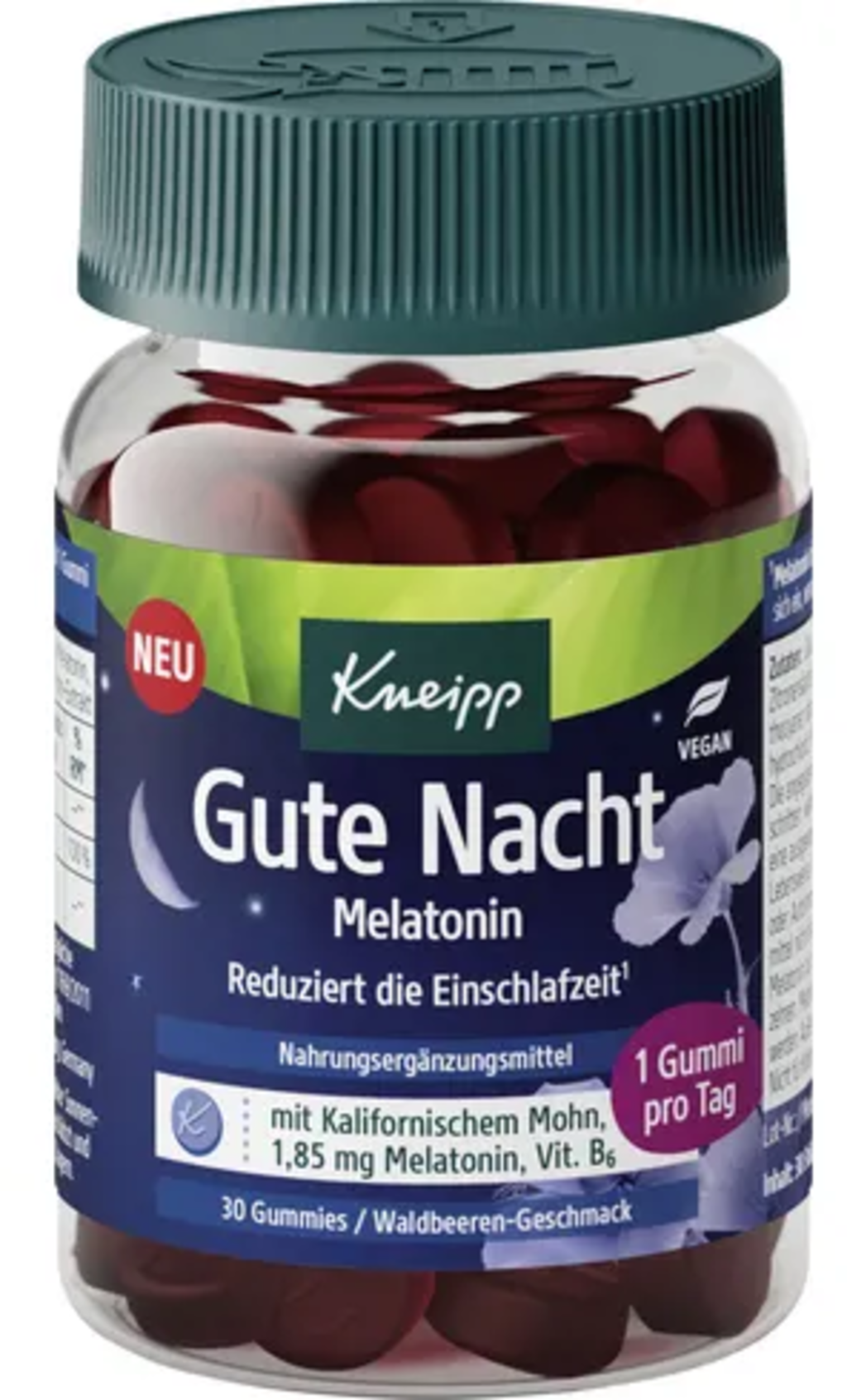 glükózszirup, cukor, ivóvíz, sűrítőszer (pektin), savanyítószer (citromsav), kaliforniai mák kivonat (California Poppy Extract), savasságot szabályozó (nátrium-citrát), színezék (antocianinok), természetes aroma, növényi olajok (kókuszdió), piridoxin-hidroklorid, melatonin, fényezőanyag (karnauba viasz)