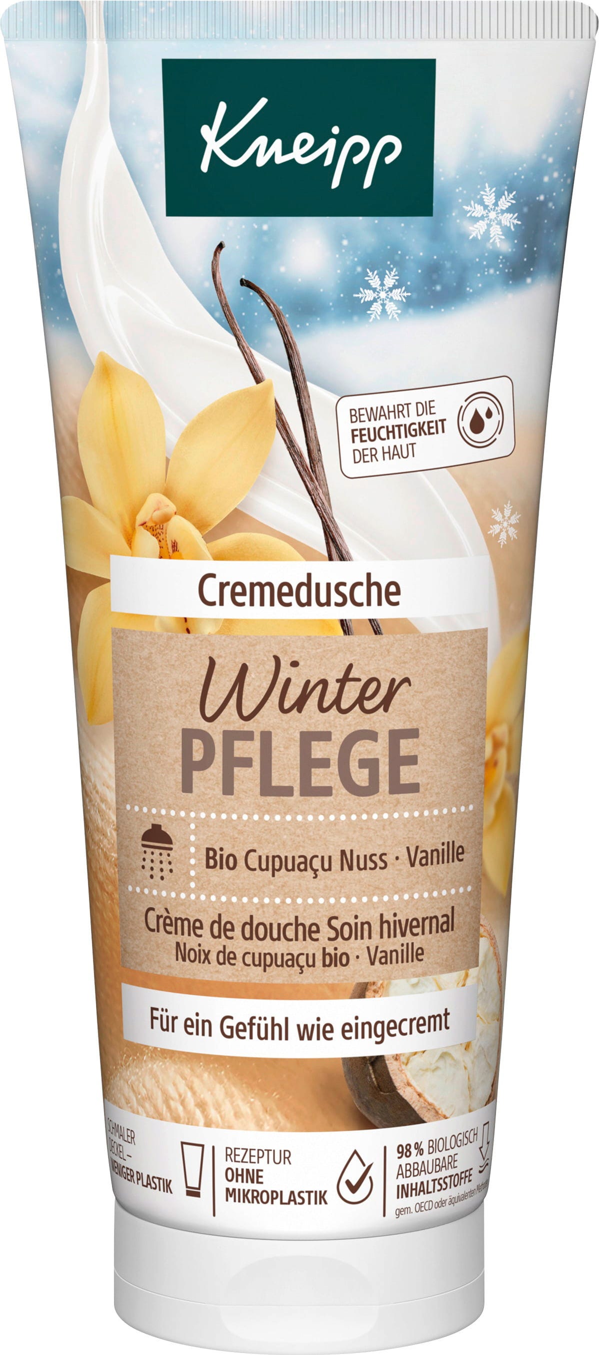 Ez a Kneipp krémes tusfürdő kellemes zuhanyélményt nyújt a fagyos napokon a bio cupuaçu dió és vanília kivonat megnyugtató, meleg illatával. A lágy, krémes textúra gyengéden tisztít, szépen eloszlatható a bőrön, és frissen hidratált érzetet hagy maga után. A növényi alapú, tápláló jojoba- és mandulaolajok szintén puha bőrérzetet biztosítanak zuhanyozás után.