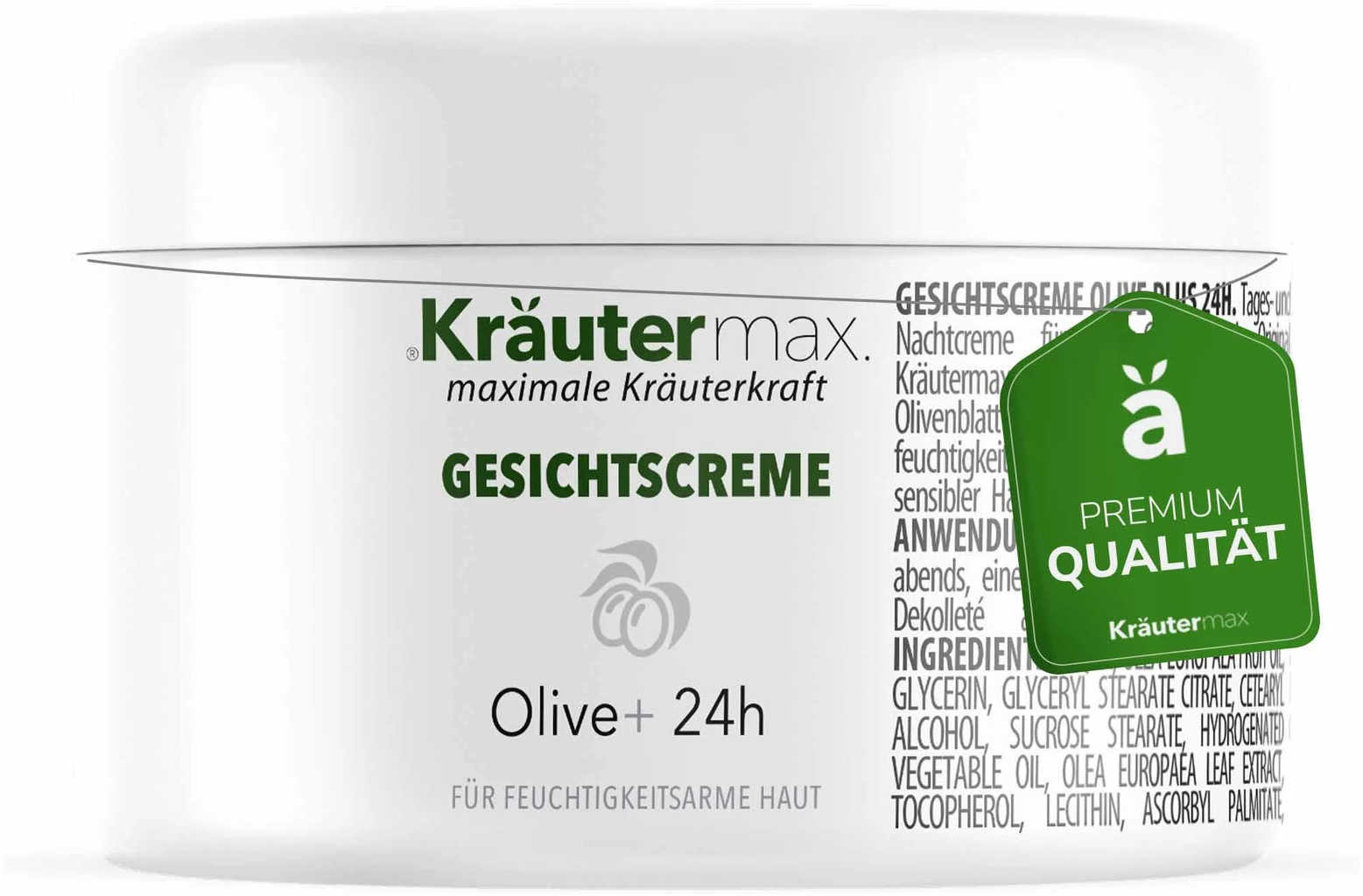 Kényeztesse bőrét extra ápolással a Kräutermax Olíva+ 24h arckrémmel. Bársonyos textúrája, hidegen sajtolt olívaolajjal, olajfalevél-kivonattal, lecitinnel és E-vitaminnal gazdagítva, intenzív hidratálást biztosít a száraz és érzékeny bőrnek – nappal és éjszaka egyaránt. A természetes növényi kivonatok támogatják a regenerációt és visszaállítják a bőr természetes egyensúlyát.