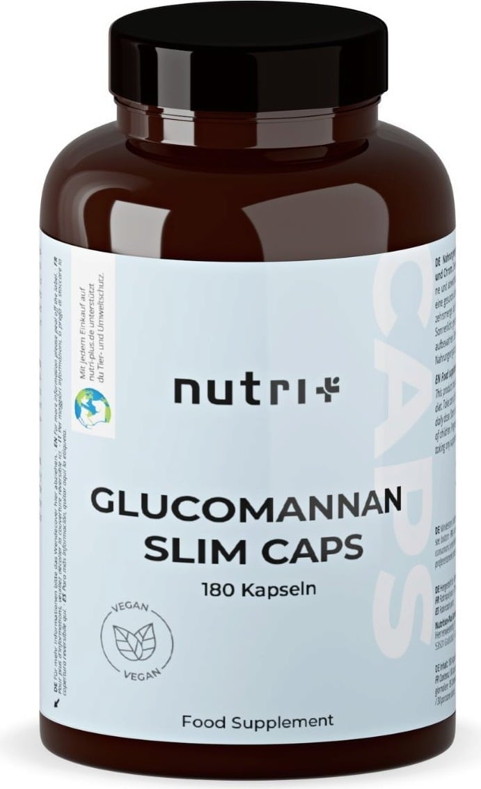 A nutri+ Glucomannan Slim Caps természetes konjac glükomannánt kombinál krómmal és B12-vitaminnal.
