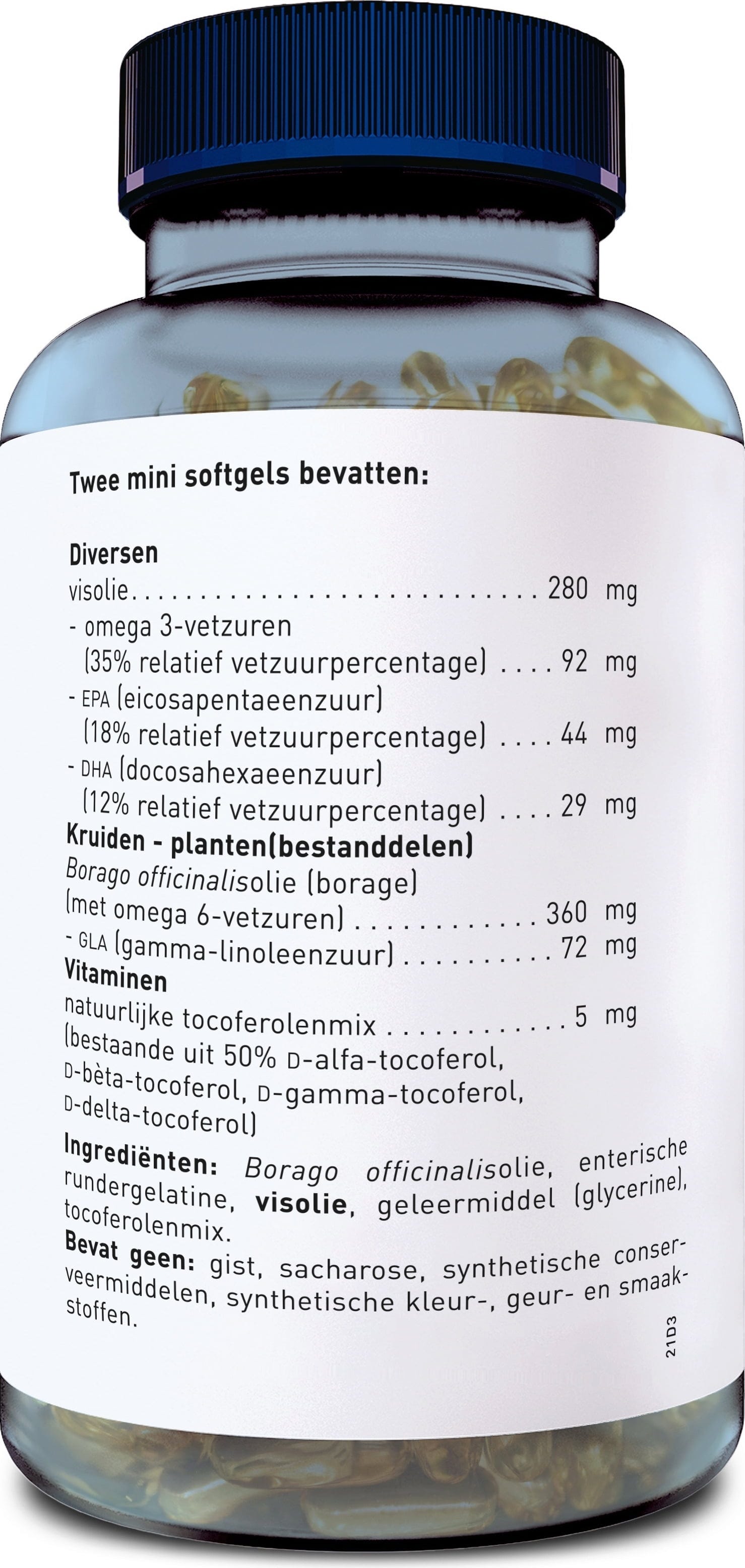 borágó olaj, kapszulahéj (marha zselatin, glicerin), halolaj (hal), antioxidánsok (természetes tokoferol keverék)