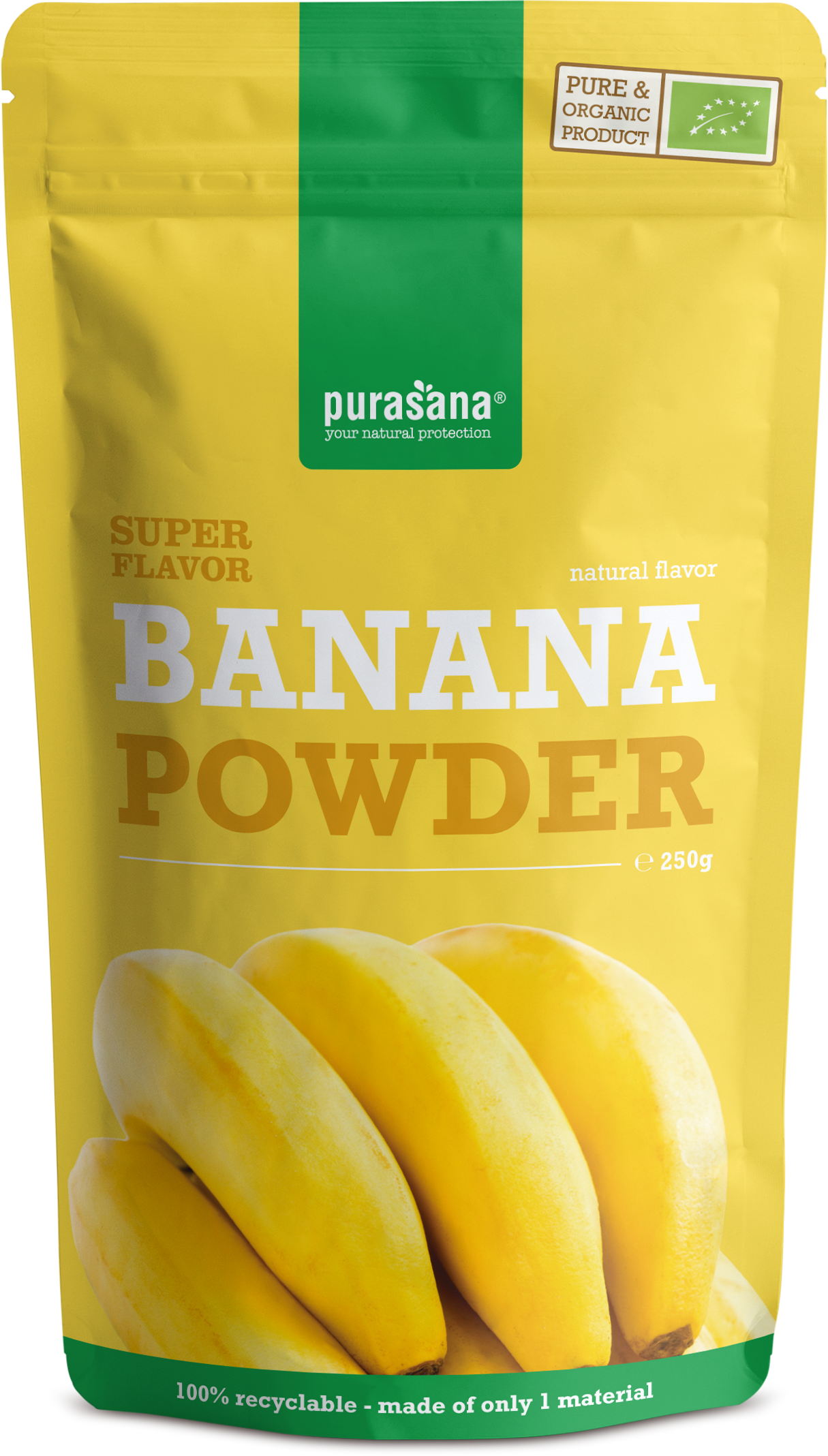A Purasana Bio Banánpor egy 100% -os tisztaságú, biológiai banánpor, amely fán érlelt, szárított banánból készült.