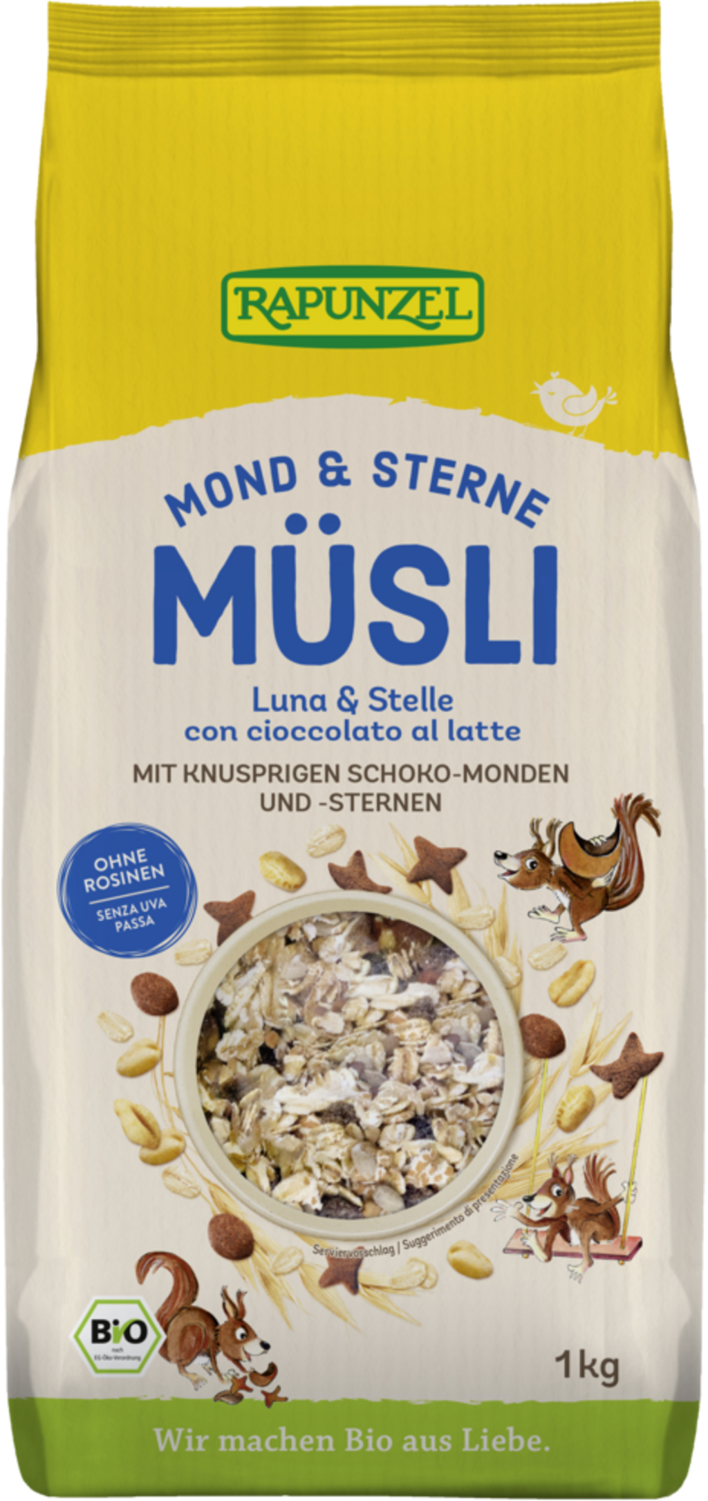 Holdak és csokoládéropogósból készült csillagok, tápláló gabonapehely, teljes kiőrlésű pehely és édes tejcsokoládéforgács teszi ezt a müzlit tökéletessé! Ideális friss gyümölccsel, joghurttal vagy tejalternatívákkal is. A gabona a müzlihez német bio-gazdálkodásból származik.