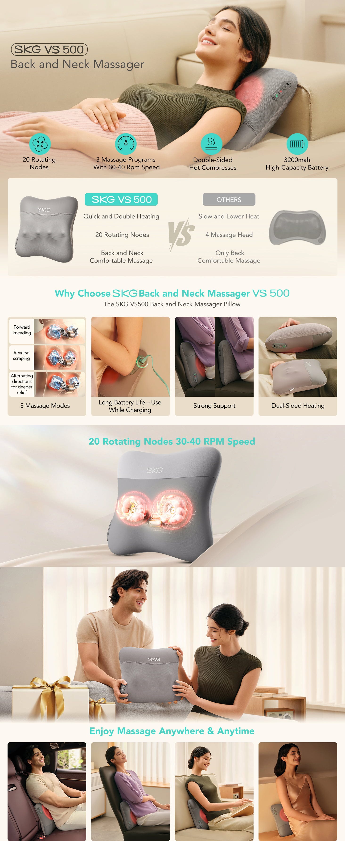 Az SKG VS500 a Human-Kneading technológiát alkalmazza, amely 20 forgó masszázscsomó segítségével a klasszikus kézi mozdulatokat utánzó mechanikai mozgássorozatokat hoz létre. Ezek a csomók váltakozó előre- és hátrafelé irányuló mozgást végeznek, ami lehetővé teszi az izomcsoportok nagy felületű megdolgozását. Az ergonomikus, 360°-os formának köszönhetően a termék nemcsak a nyak és a váll területén, hanem az ágyéki gerincszakaszon és a combokon is alkalmazható.