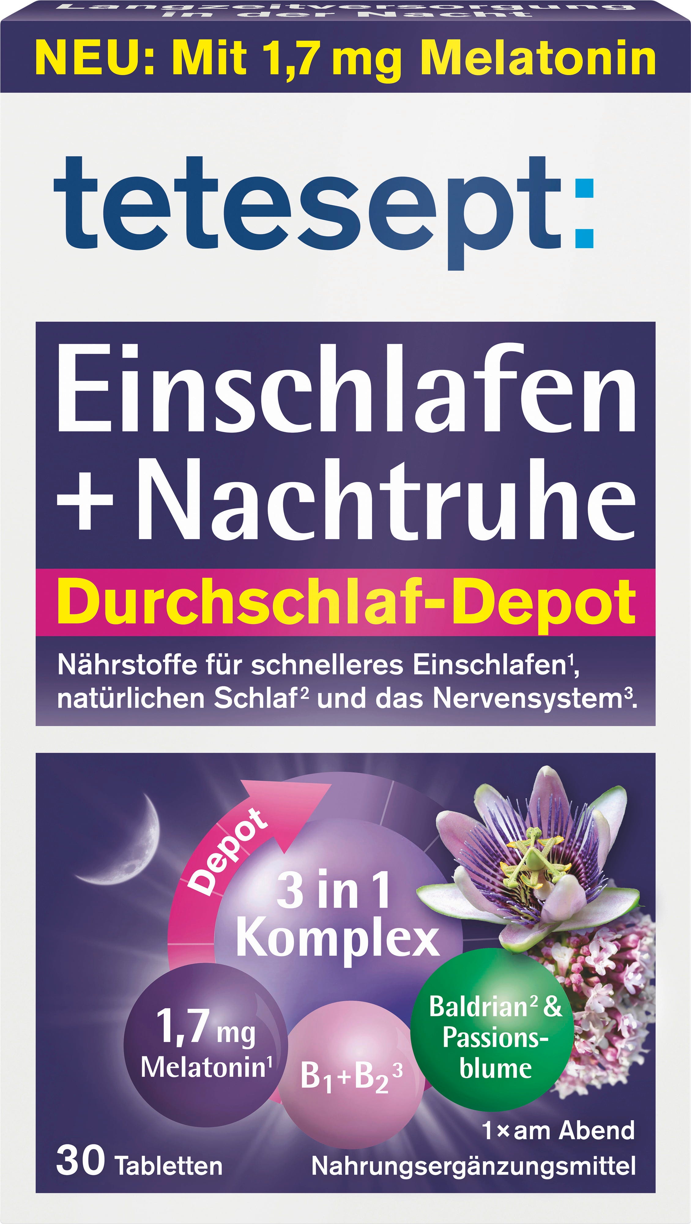 A tetesept vegán Elalvás + Éjszakai nyugalom tablettája melatonint, macskagyökeret, golgotavirágot, valamint B1- és B2-vitamint tartalmaz. A Depot formulának köszönhetően az összetevők az éjszaka folyamán folyamatosan szabadulnak fel.