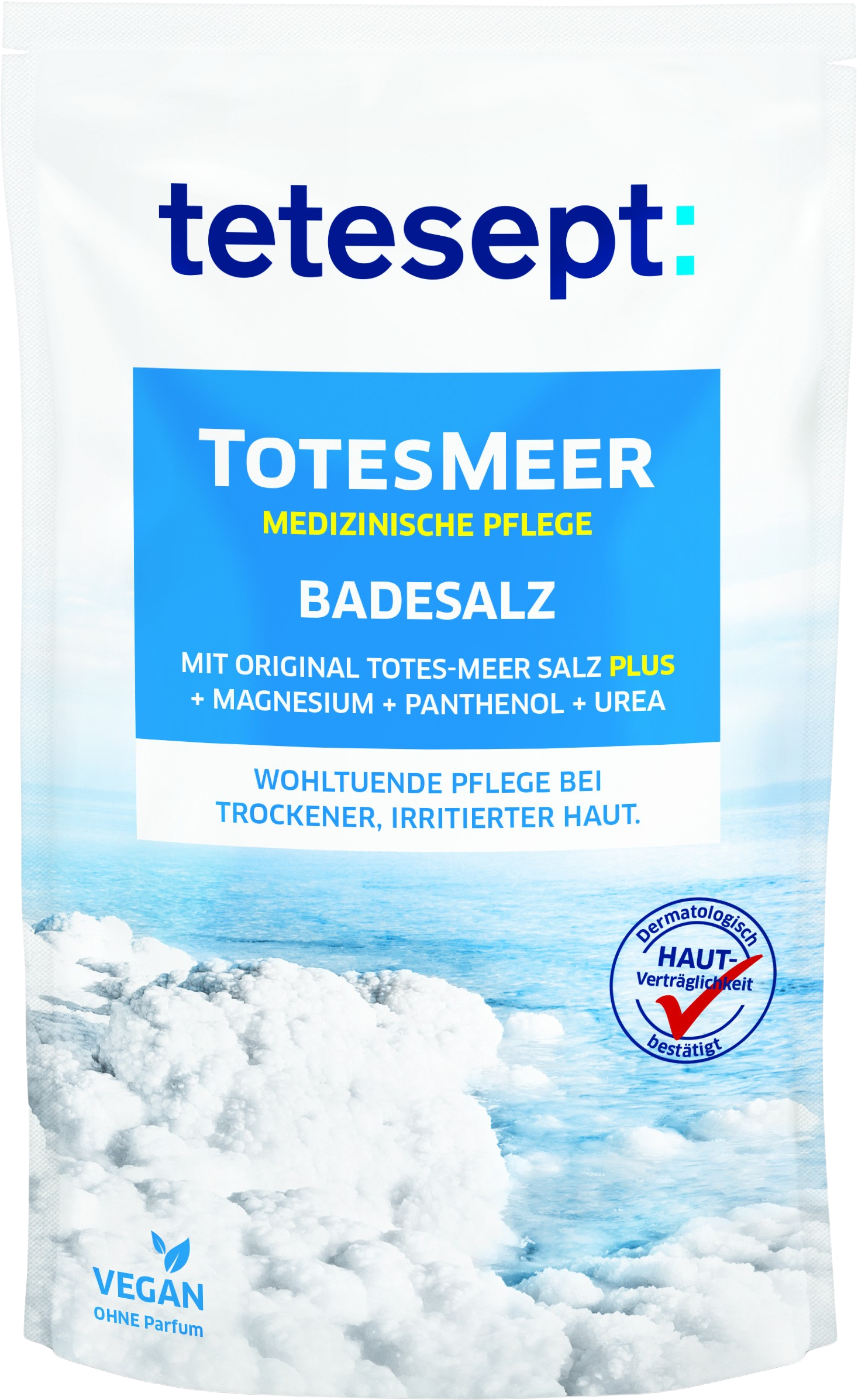 Ez a tetesept fürdősó tiszta, természetes tengeri sóból, eredeti Holt-tengeri sóból és a bőre számára értékes összetevőkből készül! Pantenolt, glicerint, karbamidot, E-vitamint, mandulaolajat és magnézium-citrátot tartalmaz, amelyek gyengéden tisztítják a bőrt, eltávolítják az elhalt hámsejteket, és csodálatosan puhává és rugalmassá teszik azt!
