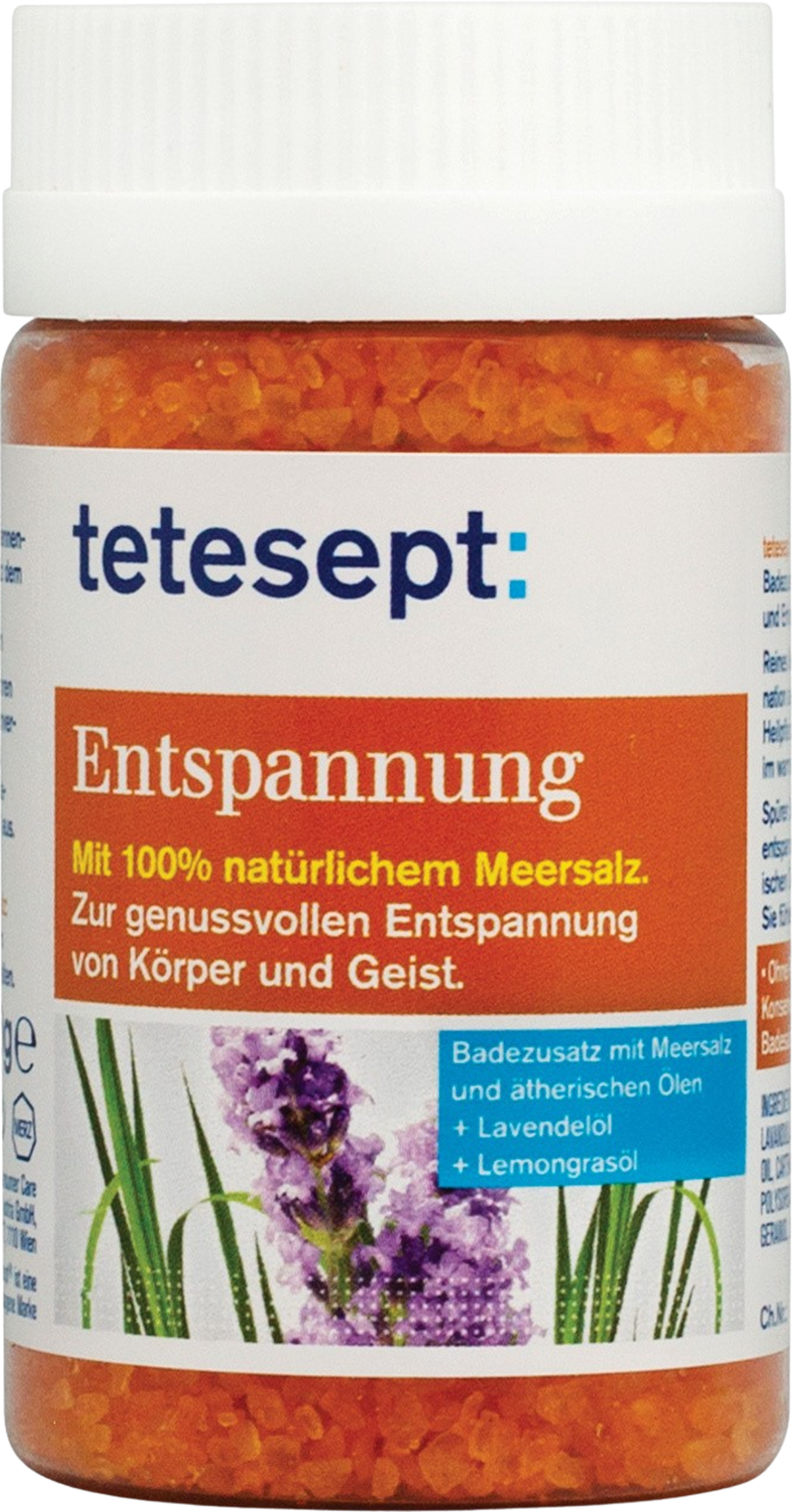 A mindennapok nyüzsgésében fontos, hogy egy kis szünetet tartsunk és kikapcsolódjunk. A tetesept "Relaxáció" tengeri fürdősó tökéletes támogatást nyújt! 100%-ban tiszta természetes tengeri sóból készült, csodálatosan meleg illattal kényeztet, amelyet a levendula, a citromfű és a citromfű természetes illóolajai adnak.